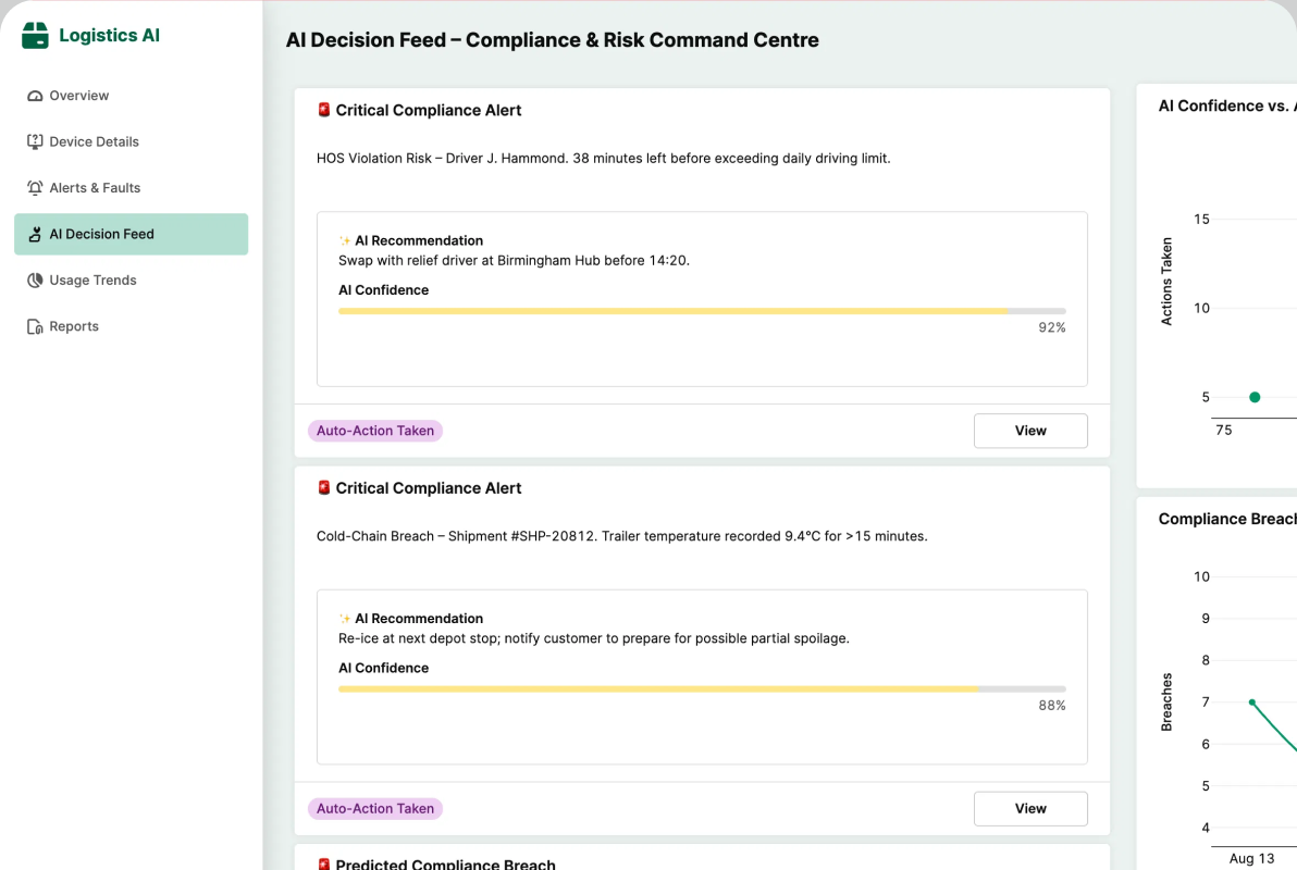 A real-time compliance and risk command centre that surfaces critical and predicted breaches across operations. It turns live data into prioritized alerts, AI-recommended actions, and confidence scoring — with optional auto-mitigation — so teams can prevent violations before they happen.